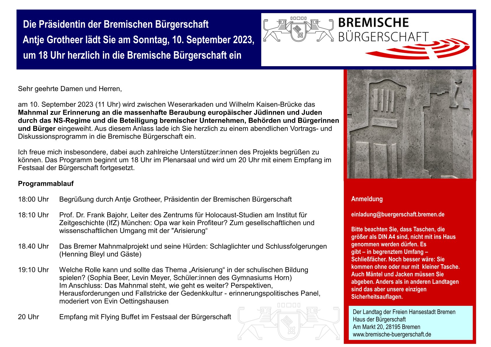On the occasion of the inauguration of the memorial commemorating the mass robbery of European Jews by the Nazi regime and the involvement of Bremen companies, authorities and citizens, I cordially invite you to the following event on