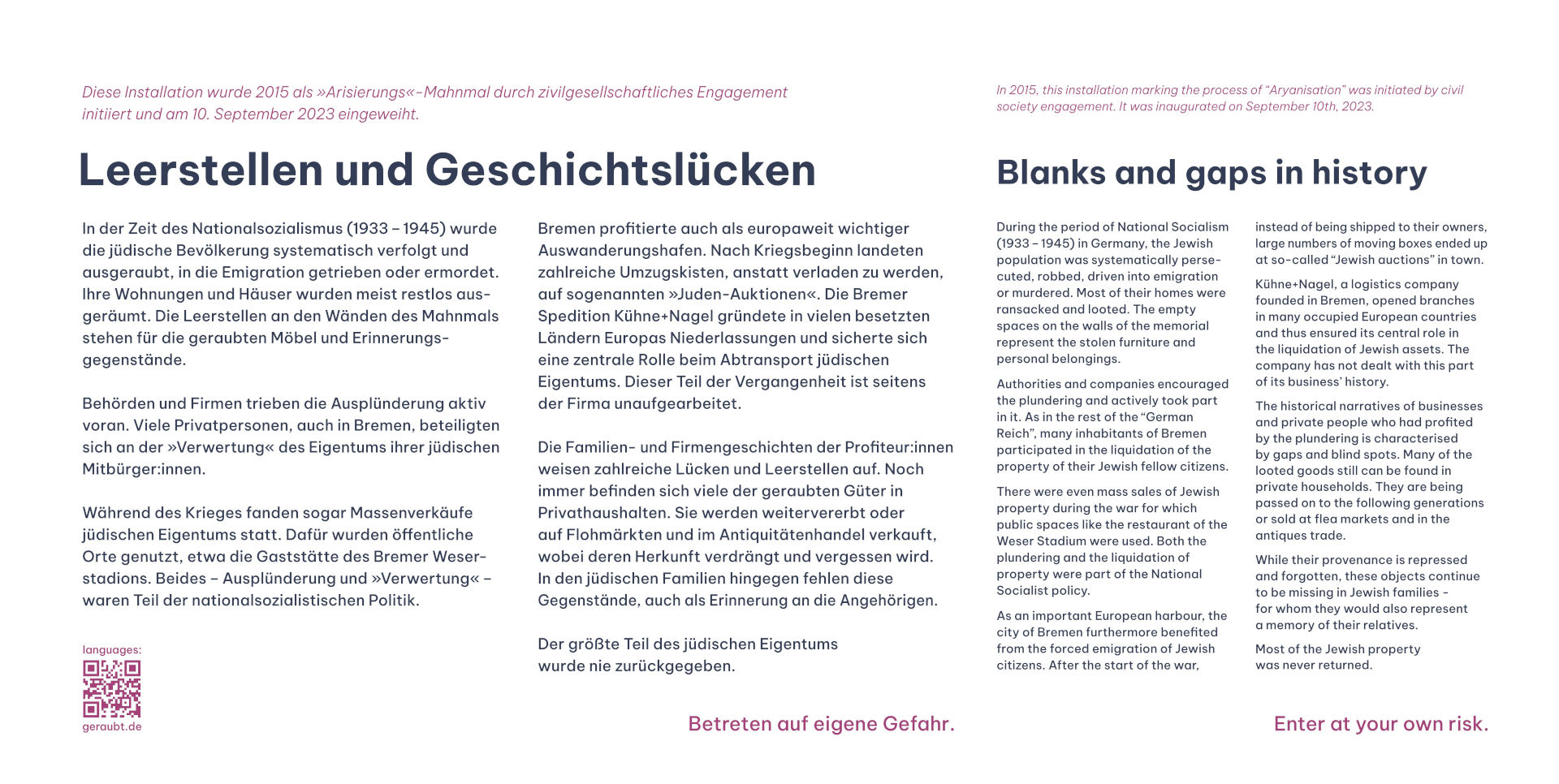Ten proces negocjacji został powtórzony przy formułowaniu tekstów tablicy pamiątkowej. W każdym razie nie jest łatwym zadaniem przedstawienie procesów, zaangażowania i odpowiedzialności w powszechnych procesach »aryzacji«, zwłaszcza w Bremie, tak krótko i poprawnie, jak to tylko możliwe. Zwłaszcza, że nie ma na to przykładów w domenie publicznej: Pomimo swojego kluczowego znaczenia dla stabilizacji systemu nazistowskiego, cały temat »aryzacji« jest nadal ledwo obecny w przestrzeni publicznej. Brema odegrała tu pionierską rolę. Jednak podczas tworzenia tekstu, podobnie jak w przypadku pytania o lokalizację, następujące pytanie okazało się szczególnie trudne: W jakiej konkretnej formie Kühne + Nagel pojawia się na tych tablicach? I jakiego rodzaju procedura zostanie użyta, aby to wszystko rozstrzygnąć?
